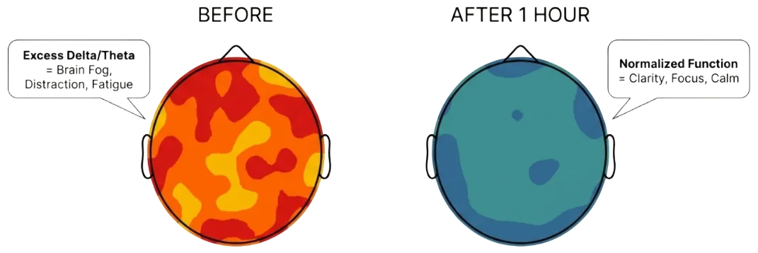 Quantitative EEG (qEEG) brain maps visually document the transformation. After just one hour in the EESystem, brain scans show a marked reduction in excessive Delta and Theta waves—the neurological signature of brain fog—and a clear normalization of brain function.