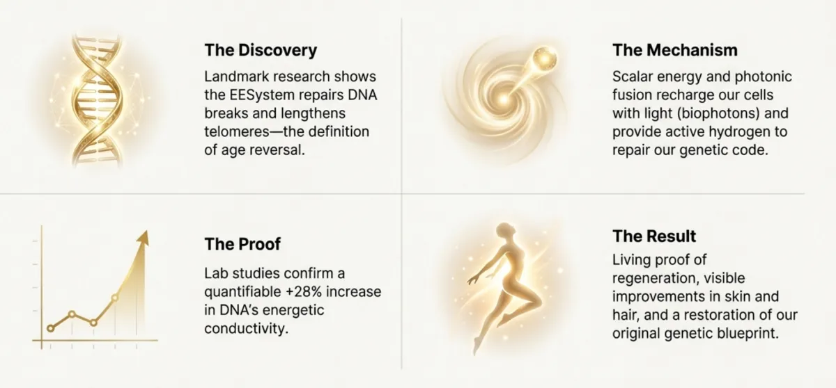 The EESystem functions as a "wireless human battery charger." The bioactive energy field it generates allows the body's trillions of cells to recharge, replenishing their store of biophotons. This process raises the millivoltage of every cell, increasing the energy available for repair, detoxification, and regeneration. By refilling the body's light storage, the system empowers the DNA to function at its peak and execute its regenerative programs.