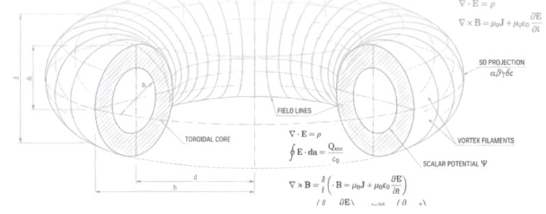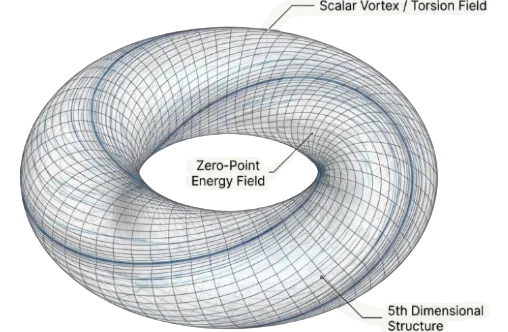 The energy from the phase-conjugate implosion is transduced from a 3D electromagnetic state into a 5th-dimensional static field. This structure is known as a Scalar Vortex or Torsion Field.