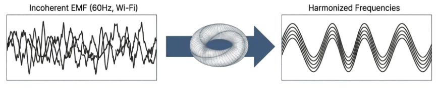 The system generates a “scalar null zone effect,” a field that neutralizes or transmutes detrimental electromagnetic fields (EMF). This is not a blocking effect, but a transformation of incoherent waveforms into coherent, beneficial frequencies.