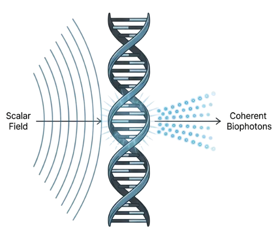 Connecting the Physics: This model provides a mechanism for the effects of scalar energy. The “photonic fusion” generated by the system’s scalar vortex interacts directly with the biophotons stored in DNA, “activating the light at the core of the DNA” and influencing cellular function at its most fundamental level. Disease is described as a loss of this coherent light.