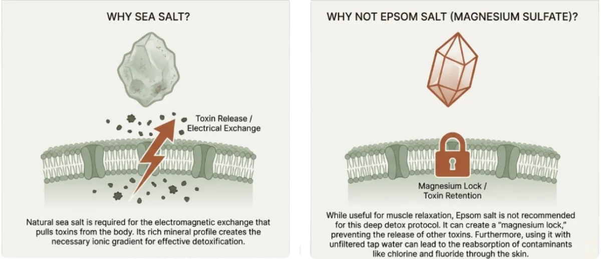 After charging your body with the EESystem, a specific bath protocol is essential to facilitate the release of mobilized toxins. The heat opens the skin’s pores (the “third kidney”), and the specific ingredients create an osmotic gradient to pull toxins out.
