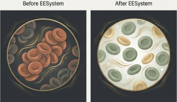 Dark field microscopy before sessions often shows rouleaux formation (stacked red blood cells) and low oxygenation. After EESystem exposure, samples show dramatically improved blood profiles, with free-flowing, perfectly formed, and well-oxygenated red blood cells.