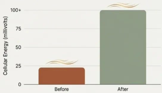 Using equipment that measures energy flow through the body’s meridians, studies by Dr. Mike Cook and Dr. Tom Loe demonstrated a 100% success rate in raising cellular energy levels, with millivoltage increasing significantly after just one hour.